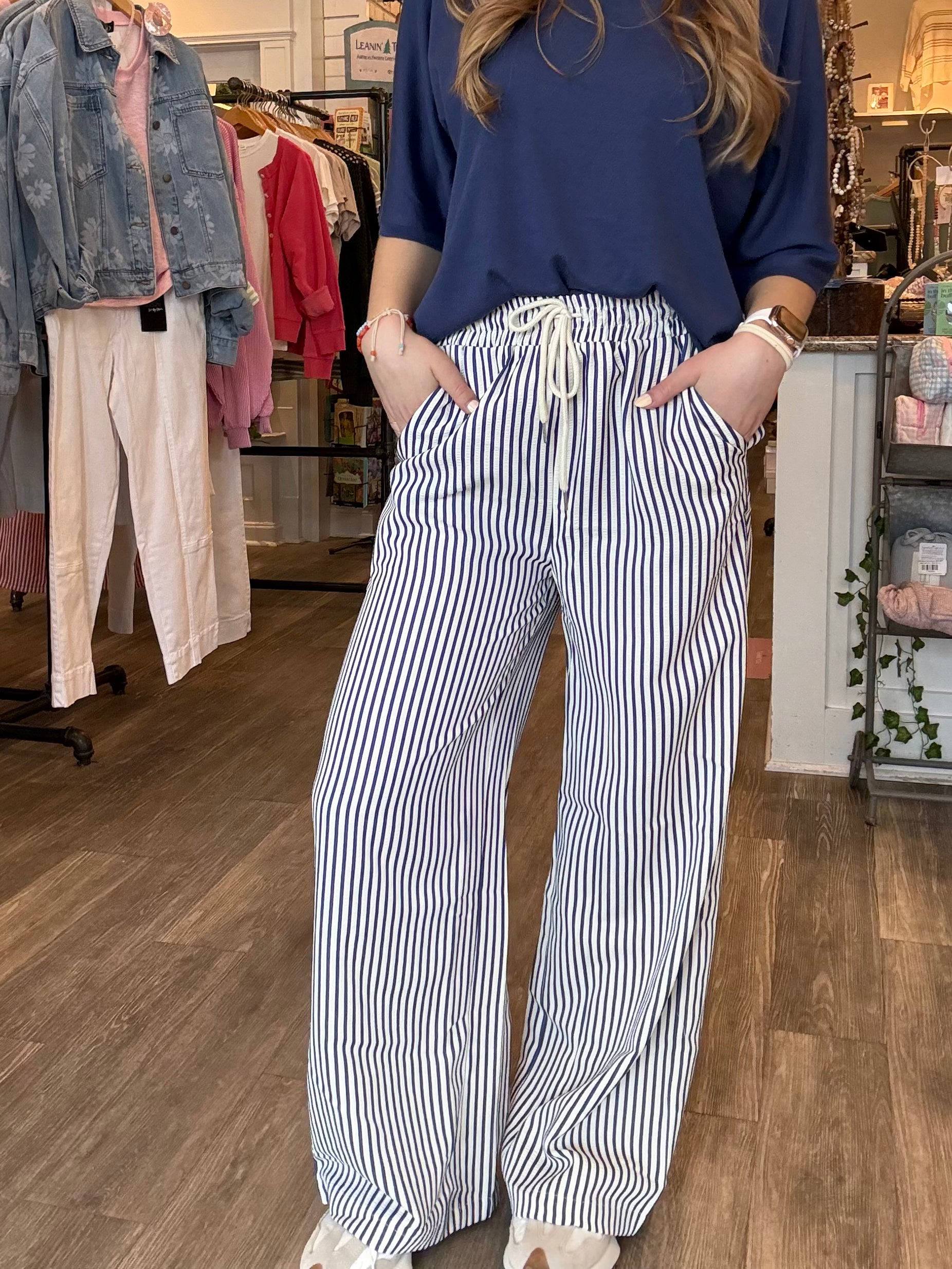 Crisp navy and white stripes bring timeless style to this versatile pant. Perfect for building a polished wardrobe, it pairs effortlessly with solid tops and blazers for work or weekend wear. The classic stripe pattern adds visual interest while remaining easy to coordinate with your existing pieces.