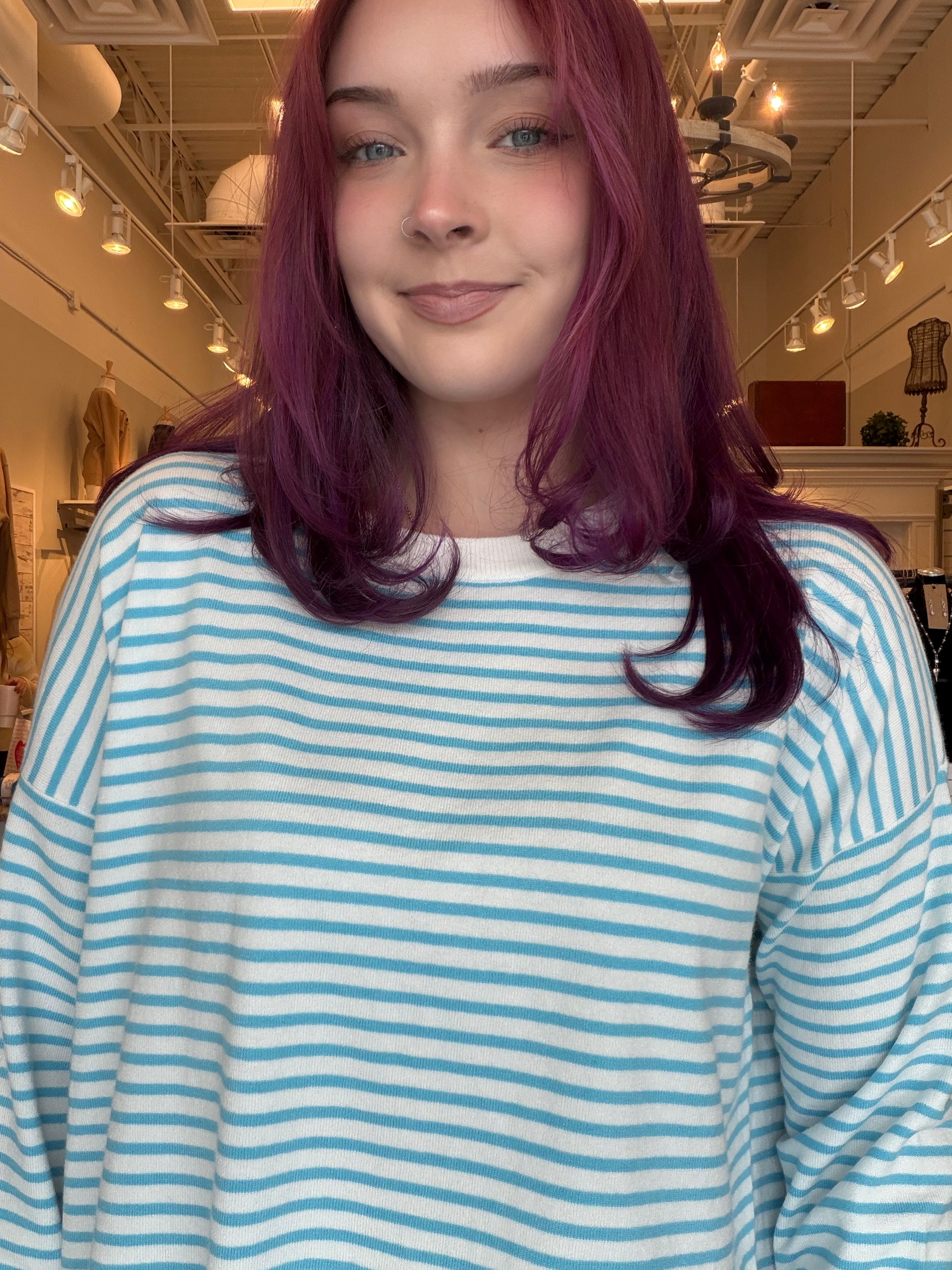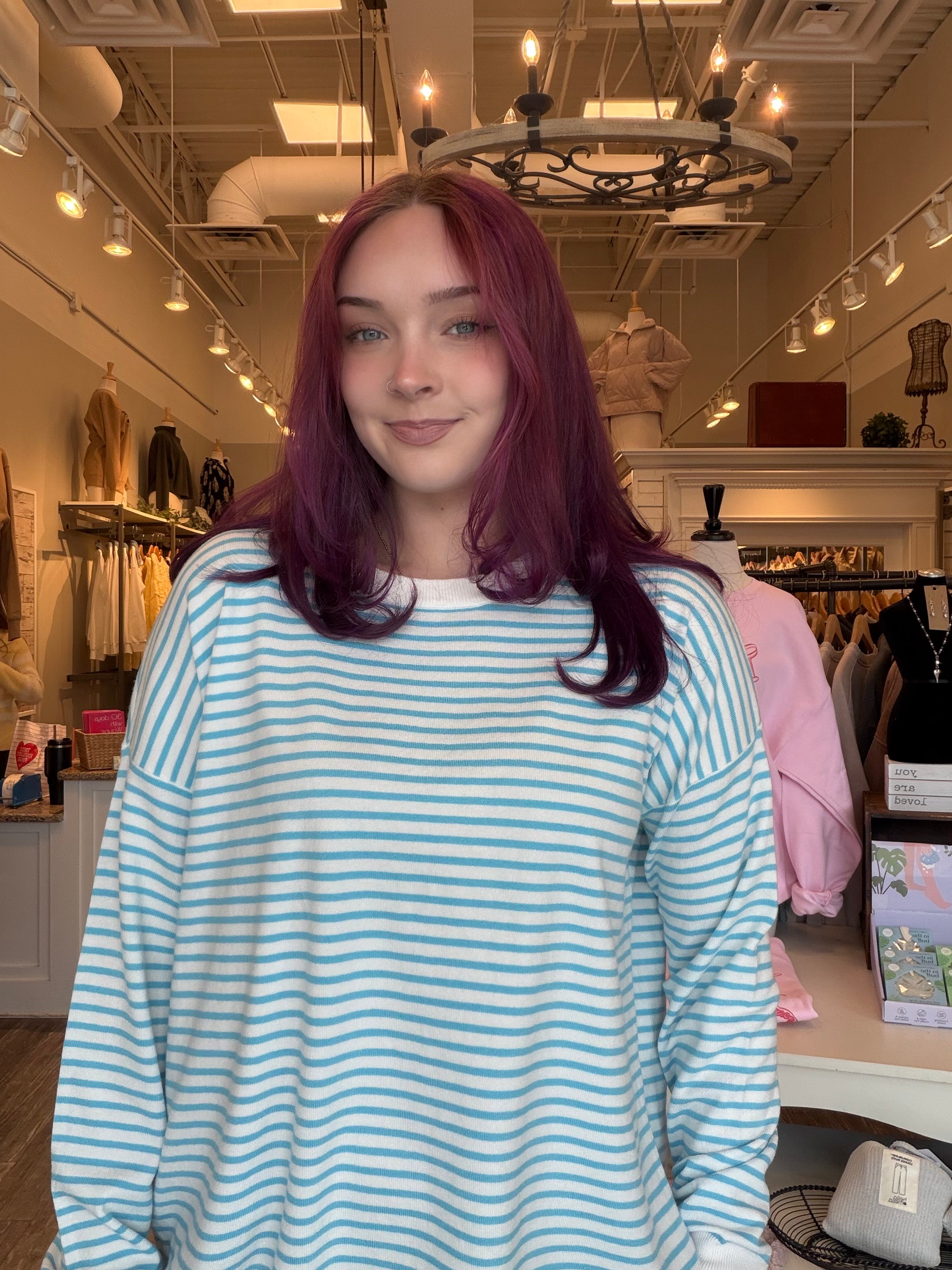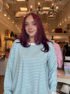 Drift into comfort with this dreamy striped top that's as soft as a cloud. Featuring gentle stripes that dance across the fabric, it's the perfect piece for effortless style that feels like wearing a cozy hug. Whether you're lounging at home or out and about, this playful top brings a touch of whimsy to your everyday wardrobe. Pair it with your favorite jeans or layer it for extra charm. Pure softness meets pure fun.